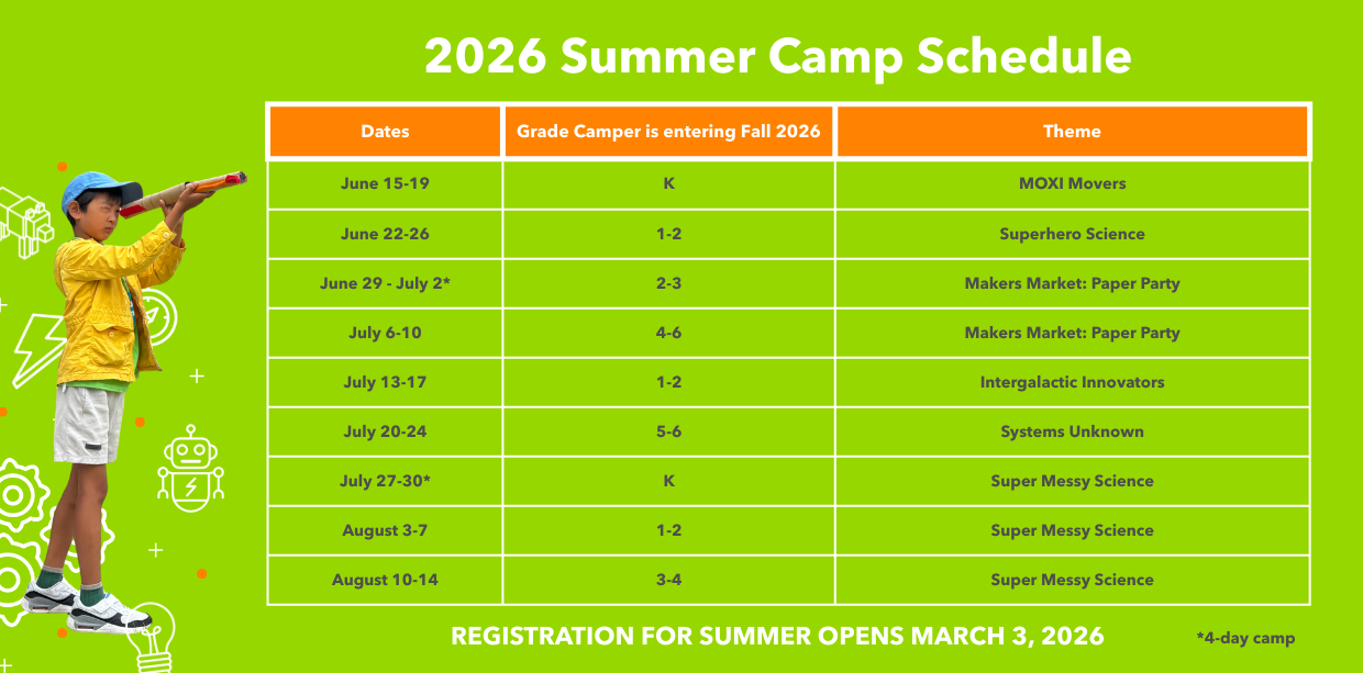 All requests to cancel participation in a camp must be made in writing to camps@moxi.org. Cancellations requested up to one month prior to the camp start date will receive a 90% refund. Cancellations requested up to 2 weeks before the camp start date will receive a 50% refund. Cancellations requested less than 2 weeks before the camp start date are not eligible for a refund.